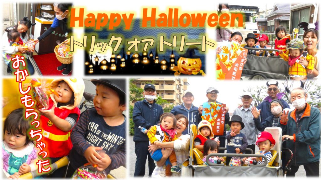 子ども達の「トリックオアトリート」の掛け声とほぼ同時くらいに、嬉しそうにお菓子のプレゼントをしてくれた「わかばクリーニング」のおかあさん!